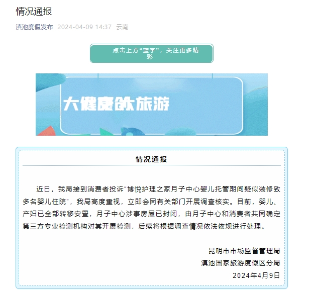 新京报讯 据滇池度假发布官微消息,近日,我局接到消费者投诉“博悦护理之家月子中心婴儿托管期间疑似装修致多名婴儿住院”,我局高度重视,立即会同有关部门开展调查核实。目前,婴儿、产妇已全部转移安置,月子中心涉事房屋已封闭,由月子中心和消费者共同确定第三方专业检测机构对其开展检测,后续将根据调查情况依法依规进行处理。