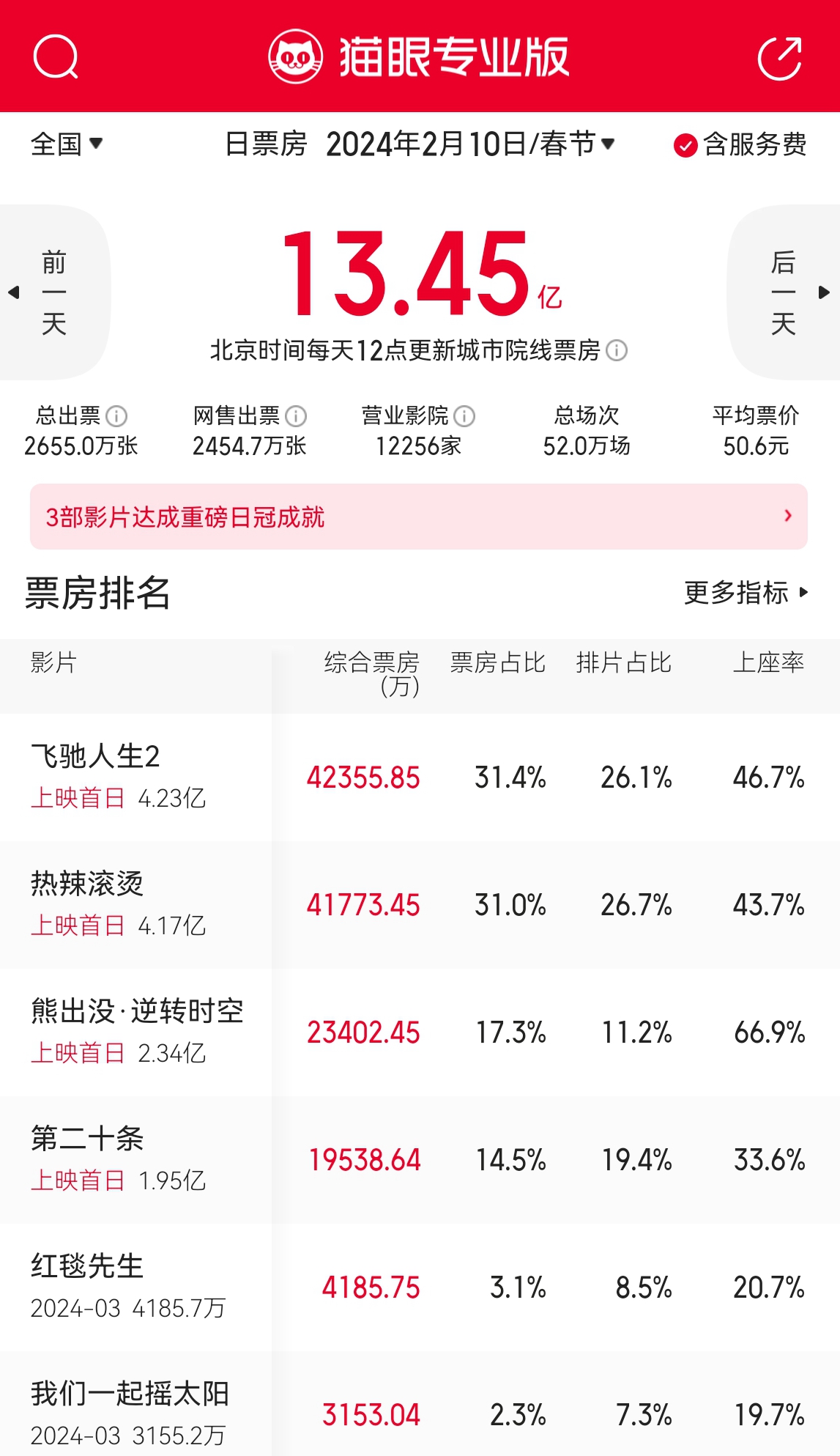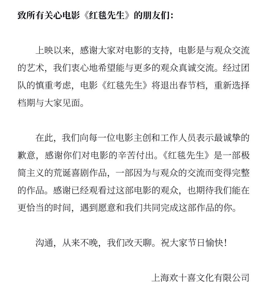 据猫眼专业版显示,今年春节档2月10日上映首日,电影《红毯先生》排片占比8.5%,首日票房收获4185万元。2月16日,该片排片占比仅剩1.5%,票房才406万元,当天晚上,出品方欢喜传媒发布声明表示:“《红毯先生》是一部极简主义的荒诞喜剧作品,一部因为与观众的交流而变得完整的作品。感谢已经观看过这部电影的观众,也期待我们能在更恰当的时间,遇到愿意和我们共同完成这部作品的你。沟通,从来不晚,我们改天聊。”该片在春节档上映7天,票房刚过8000万元。