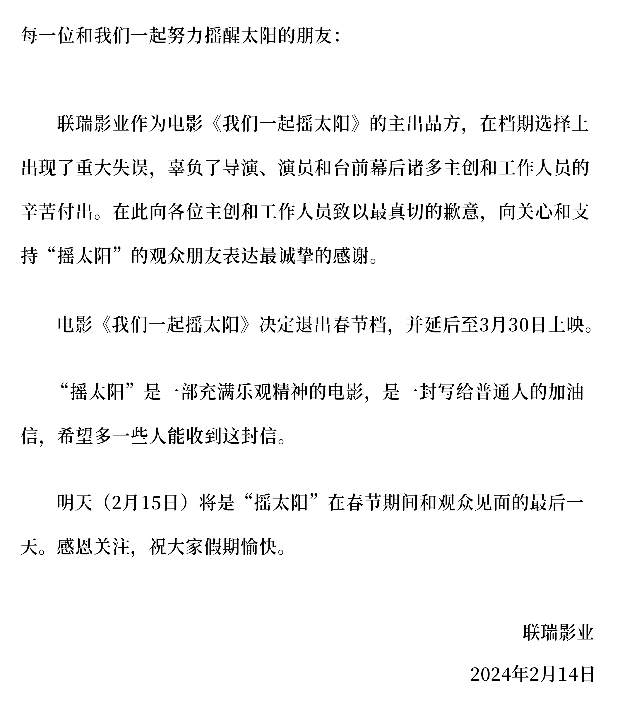 同为在春节档2月10日上映的《我们一起摇太阳》,春节档首日排片占比7.3%,首日票房收获3153万元。在上映第5天时,该片主出品方联瑞影业宣布“在档期选择上出现了重大失误”,2月15日为该片放映的最后一天,随后将撤出春节档。在撤档的同时,宣布电影将于3月30日上映。春节档期间,《我们一起摇太阳》共收获9335万元票房。
