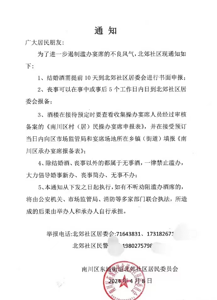 4月8日,重庆市南川区东城街道北郊社区居民委员会发布一则“遏制滥办宴席”的通知,要求居民办酒席提前进行报备,引发热议。4月9日,南川区委宣传部工作人员对新京报记者表示,该通知系社区发布,不会对居民进行强制性管理。