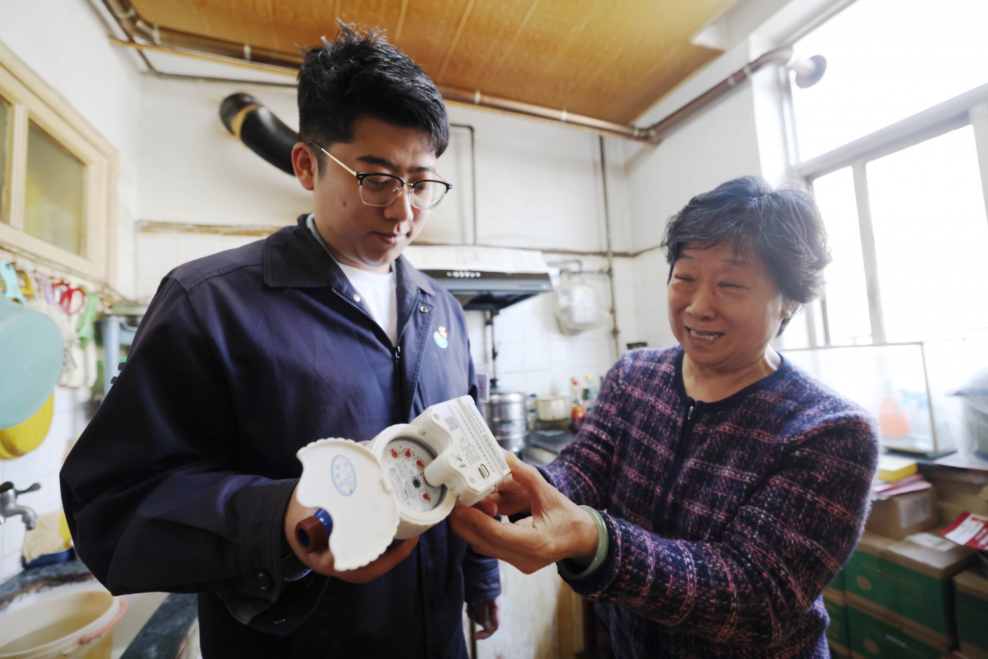3月22日,海淀区学院路18号院,自来水集团的工作人员在为居民介绍智能远传水表的便利。 新京报记者 李木易 摄