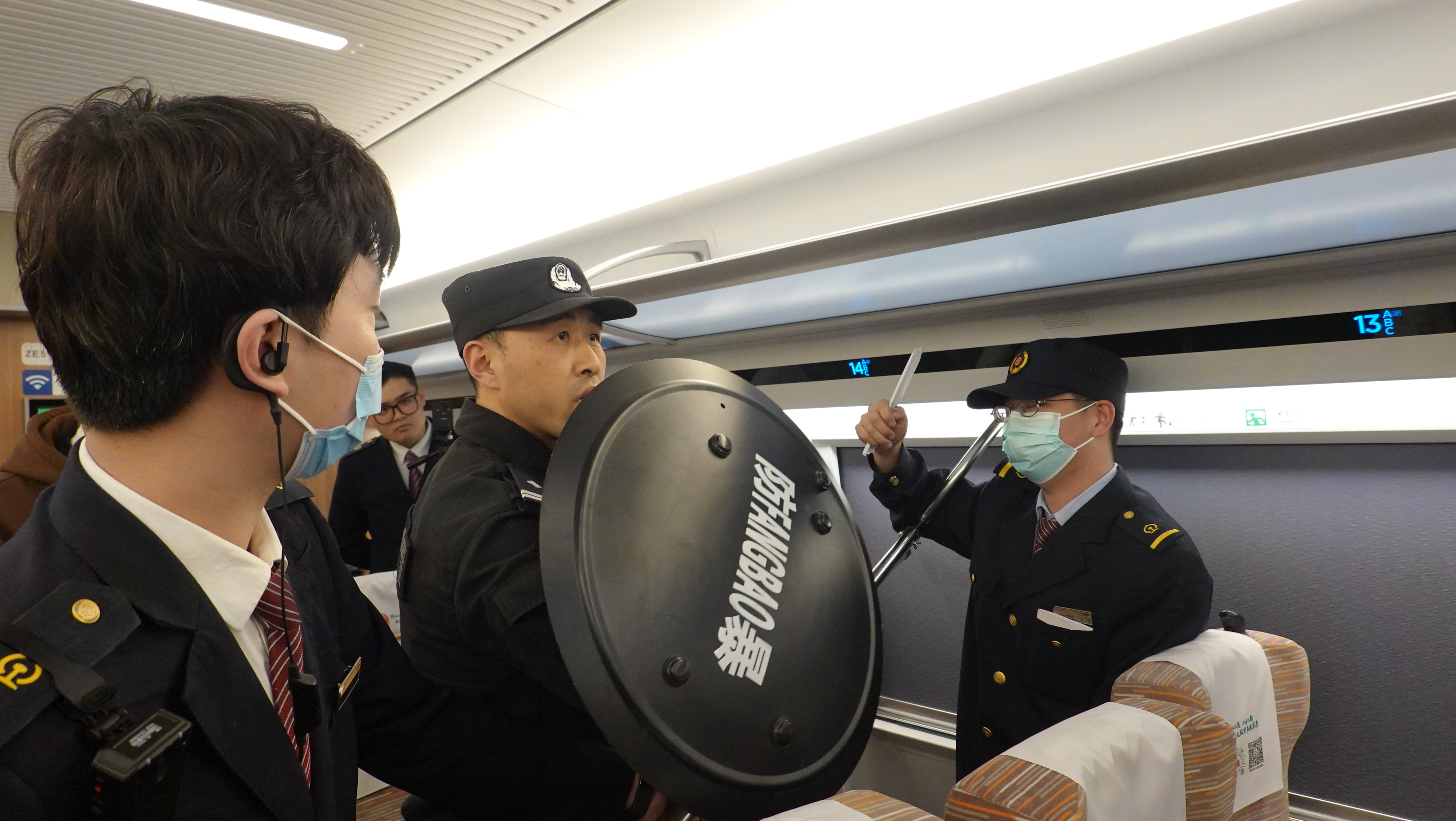 民警在列车上展开反恐防暴培训。图源:北京铁警
