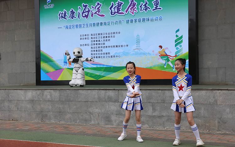 2024年4月是第36个爱国卫生月,4月13日上午,海淀区爱国卫生运动委员会在海淀区教师进修学校附属实验小学组织开展了爱国卫生月暨健康海淀行动月系列活动之健康家庭趣味运动会。图为机器人“海小卫”与现场小朋友们表演舞蹈《最炫民族风》。