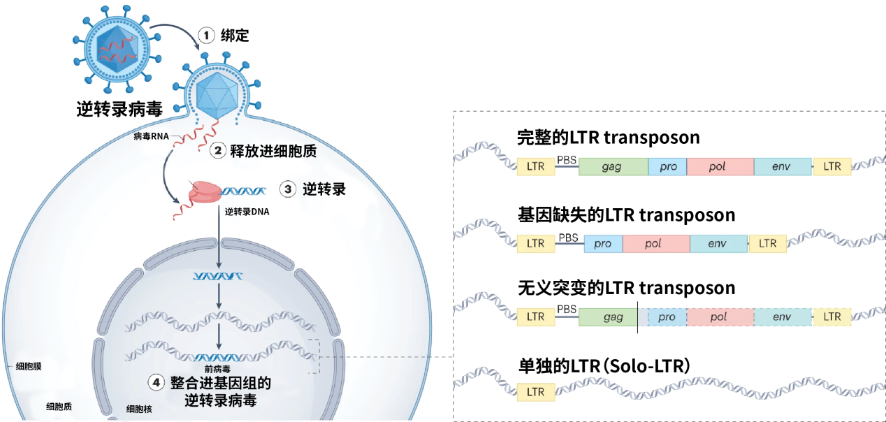 逆转录病毒的内源化过程:绑定、释放、逆转录与整合。(编辑自Dopkins and Nixon,2024)
