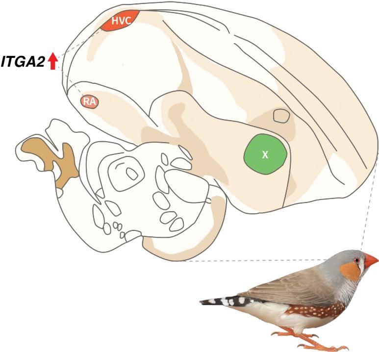 HVC、RA和X是鸣禽鸣唱控制通路的相关脑区,在斑胸草雀大脑的HVC区和RA区中都检测到了ITGA2基因的高表达。(陈星等 绘)