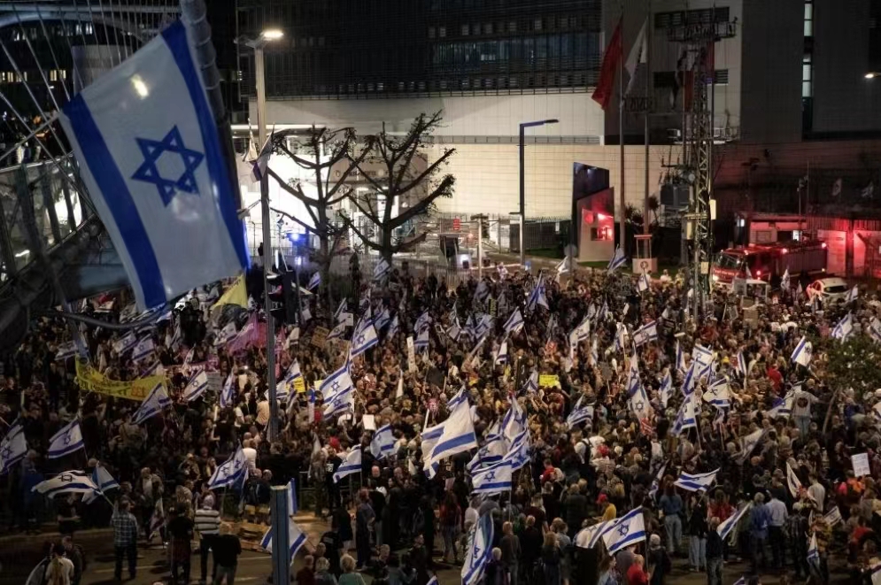 ▲当地时间4月13日晚,在以色列特拉维夫的以色列国防部前,民众在安全警告生效前举行示威集会。图/新华社