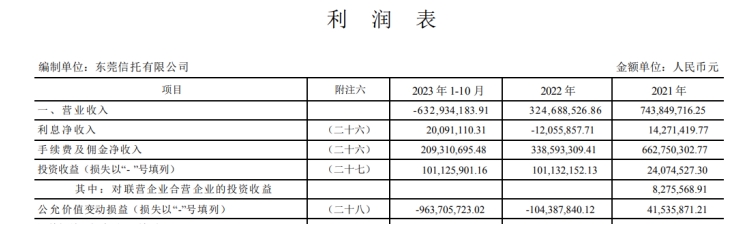 2023年1-10月份,东莞信托营收-6.33亿元,净利润-5.64亿元。其中,手续费及佣金净收入2.09亿元,但公允价值变动产生损失9.64亿元。