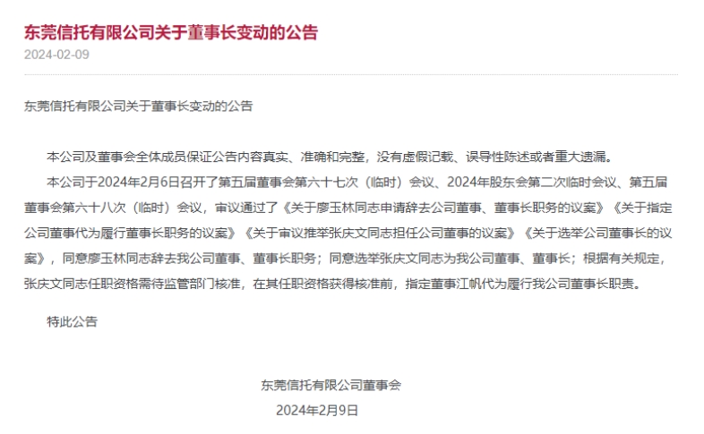 2月19日,东莞金控曾发布公告称,廖玉林不再担任公司董事长职务,董事长职务由张庆文接任,张庆文不再担任公司总经理。同月,东莞信托董事长也发生变动——东莞信托2024年2月召开了相关会议,同意廖玉林辞去公司董事、董事长职务;同意张庆文担任公司董事、董事长职务。