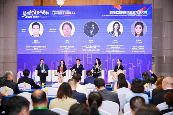 最后,北京商务中心区国际招商服务有限公司总经理张丽文主持了朝阳区营商环境主题对话交流,对话嘉宾包括朝阳“两区”建设研究院执行院长侯艺、太古地产新零售项目总经理余国安、正大侨商房地产开发有限公司写字楼总经理贾丹、SOLANA蓝色港湾副总经理(市场营销)张芷睿。