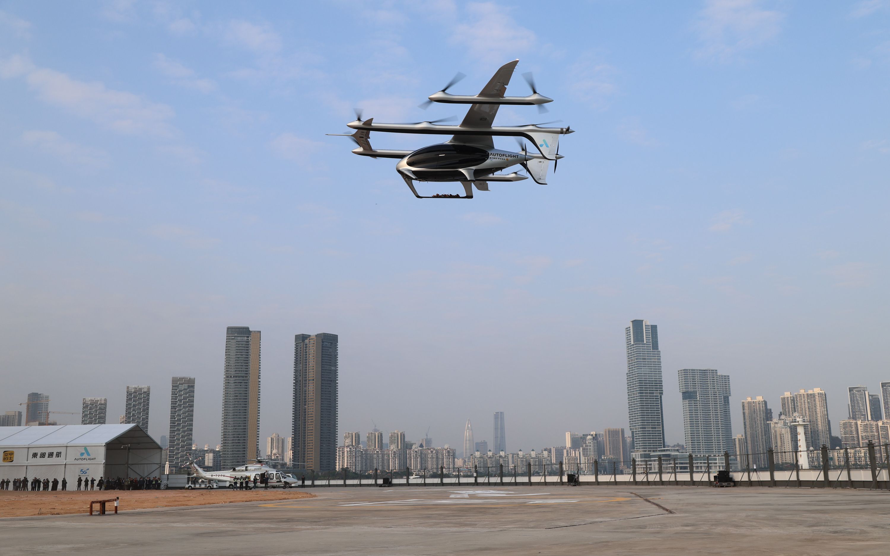 2月27日,“电动垂直起降航空器eVTOL跨城跨湾航线首次演示飞行暨峰飞航空落地深圳签约仪式”举办。5台eVTOL航空器“盛世龙”模拟从深圳蛇口邮轮母港前往珠海九洲港码头的出行场景。图//IC photo