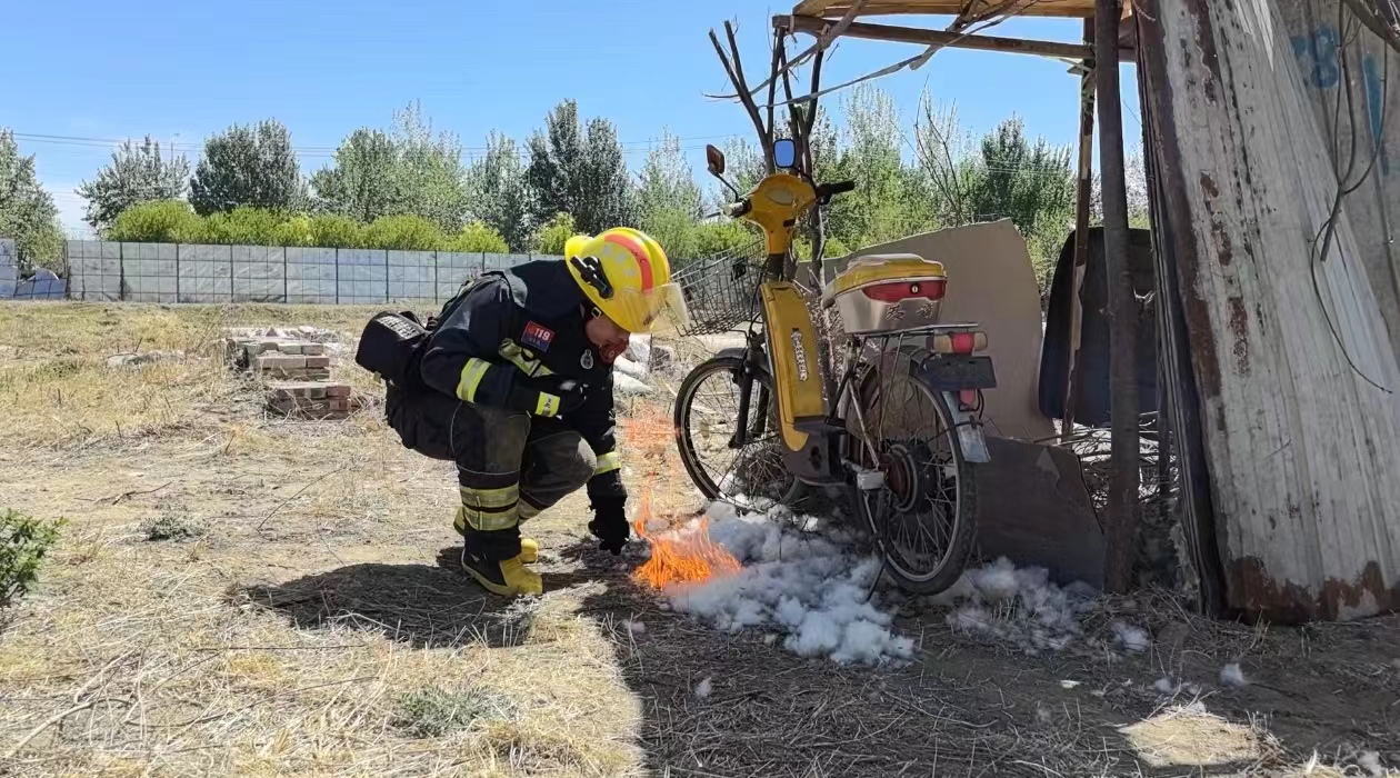 大兴区消防救援支队消防员将电动自行车附近的杨柳絮点燃。图源:大兴区消防救援支队