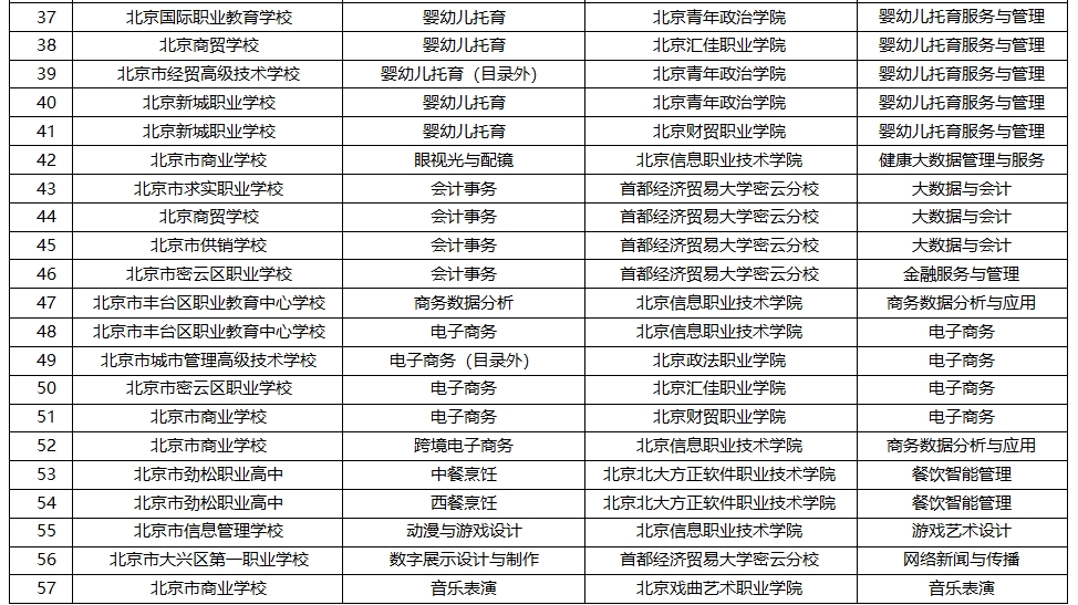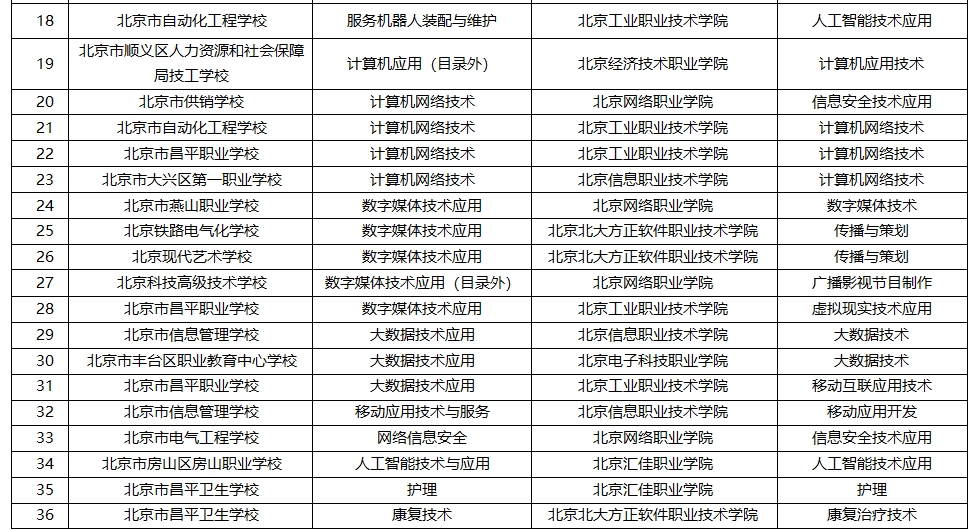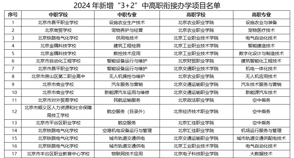 北京2024年新增“3+2”中高职衔接办学项目名单。图/北京市教委官网