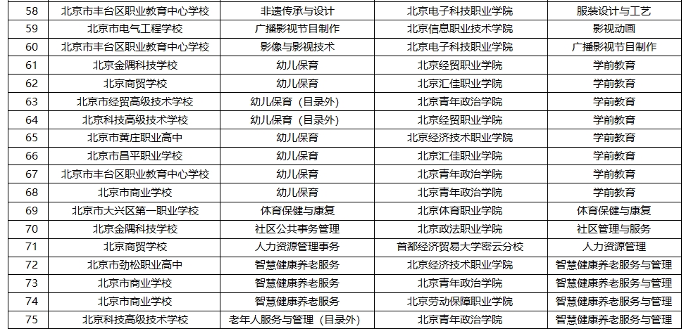 新京报讯(记者杨菲菲)4月17日,北京市教委官网公布了2024年“3+2”中高职衔接办学新增项目,涉及北京市昌平职业学校、北京铁路电气化学校、北京农业职业学院、北京工业职业技术学院等众多中高职学校共75个项目。