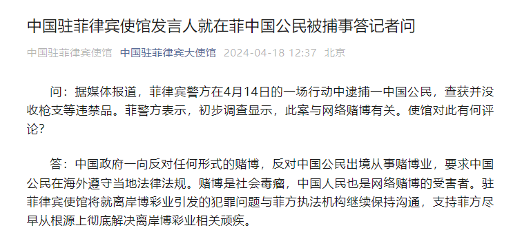 问:据媒体报道,菲律宾警方在4月14日的一场行动中逮捕一中国公民,查获并没收枪支等违禁品。菲警方表示,初步调查显示,此案与网络赌博有关。使馆对此有何评论?
