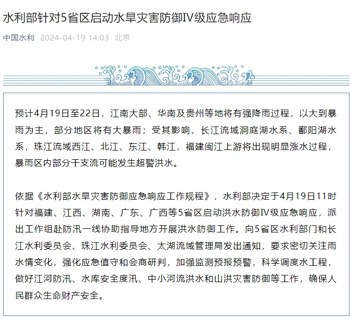依据《水利部水旱灾害防御应急响应工作规程》,水利部决定于4月19日11时针对福建、江西、湖南、广东、广西等5省区启动洪水防御Ⅳ级应急响应,派出工作组赴防汛一线协助指导地方开展洪水防御工作。向5省区水利部门和长江水利委员会、珠江水利委员会、太湖流域管理局发出通知,要求密切关注雨水情变化,强化应急值守和会商研判,加强监测预报预警,科学调度水工程,做好江河防汛、水库安全度汛、中小河流洪水和山洪灾害防御等工作,确保人民群众生命财产安全。