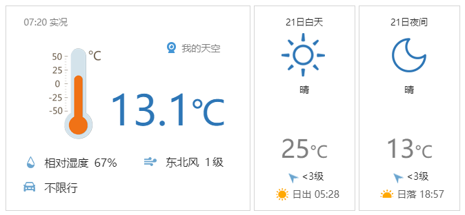 今天白天晴,北风一级转南风三级,阵风五级,最高气温25℃;夜间晴间多云,南风三级转北风一二级,最低气温13℃。