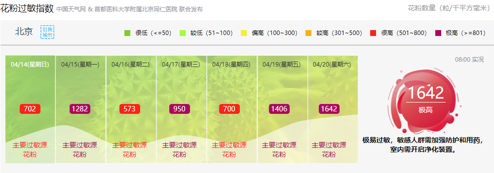 据中国天气官网数据,当前花粉过敏指数为1642,极易过敏,敏感人群需加强防护和用药,室内需开启净化装置。