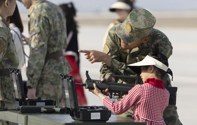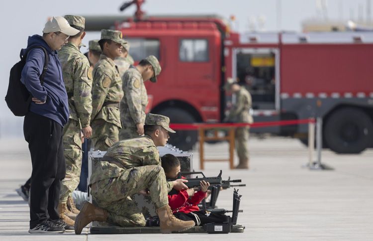 4月21日,青岛,为庆祝人民海军成立75周年,海军舰载航空兵某部组织军营开放日活动,驻地党政机关、企事业单位、院校师生、官兵家属共1500余人参加了活动。图为小朋友体验模拟射击。