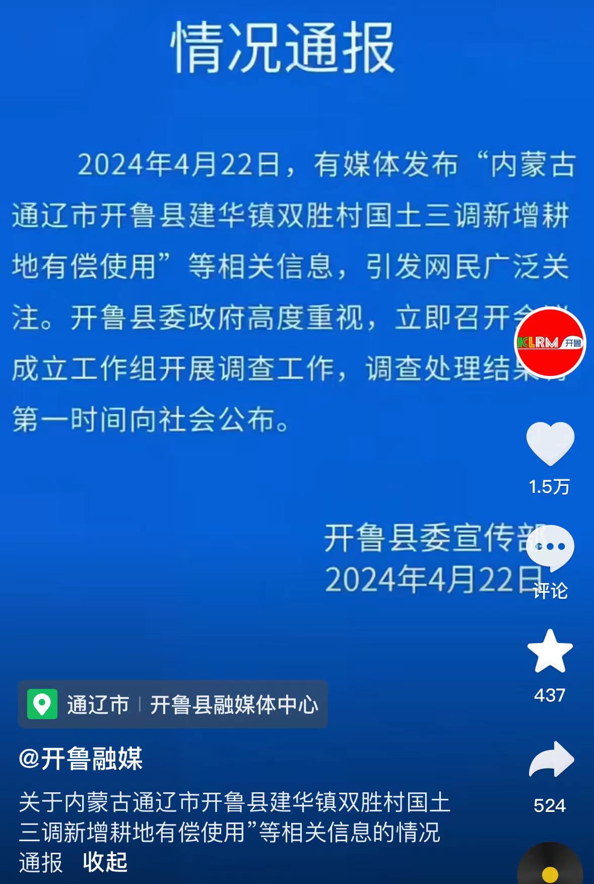 新京报讯 4月23日凌晨,内蒙古开鲁融媒在其官方抖音账号发布情况通报,称有媒体发布“开鲁双胜村国土三调新增耕地有偿使用”等相关信息,引发广泛关注。对此,开鲁县已成立工作组开展调查。以下为全文: