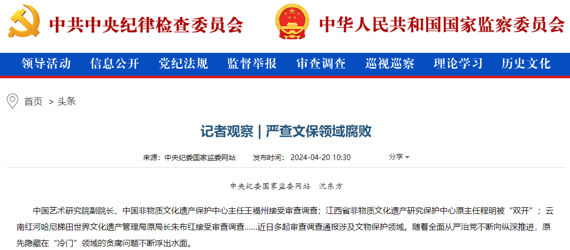 该则文章提到,中国艺术研究院副院长、中国非物质文化遗产保护中心主任王福州接受审查调查;江西省非物质文化遗产研究保护中心原主任程明被“双开”;云南红河哈尼梯田世界文化遗产管理局原局长朱布红接受审查调查……近日多起审查调查通报涉及文物保护领域。随着全面从严治党不断向纵深推进,原先隐藏在“冷门”领域的贪腐问题不断浮出水面。