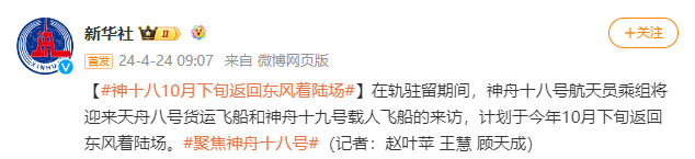 据新华社微博消息,在轨驻留期间,神舟十八号航天员乘组将迎来天舟八号货运飞船和神舟十九号载人飞船的来访,计划于今年10月下旬返回东风着陆场。(记者:赵叶苹 王慧 顾天成)