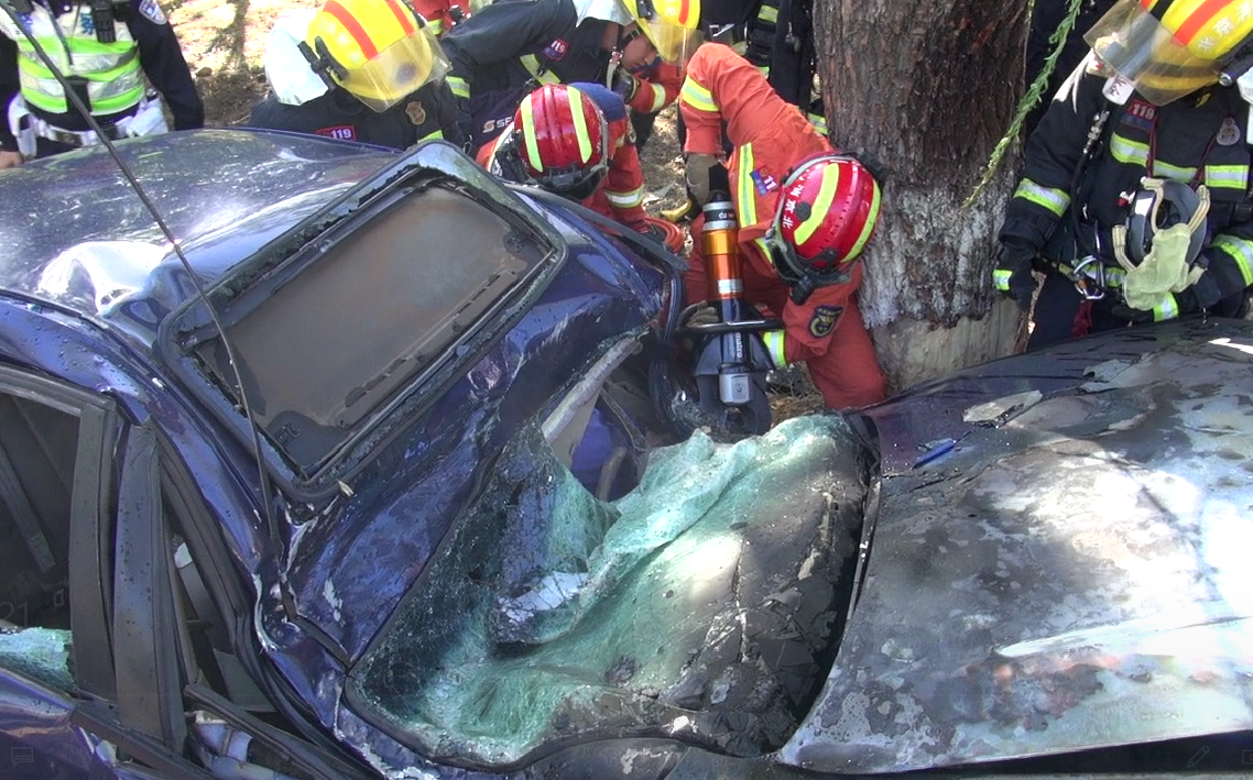 一男子驾车撞树后被困车内,昌平消防紧急破拆救援