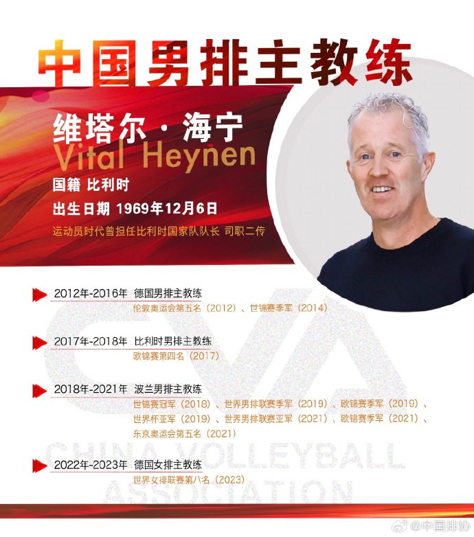新京报讯 据@中国排协 消息,为提高中国男子排球国家队竞技水平,做好新周期训练备战工作,经专家组评议,中国排球协会决定聘任比利时籍教练维塔尔·海宁为中国男排主教练。