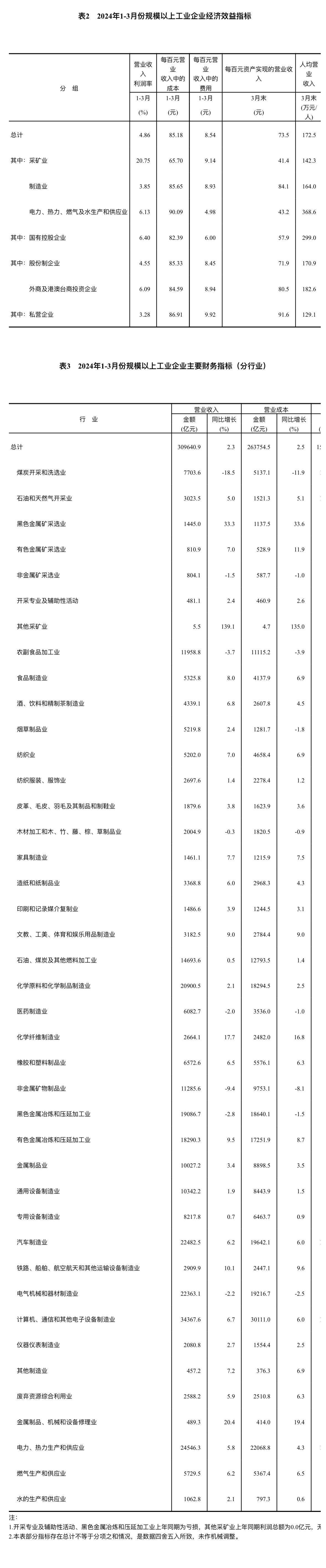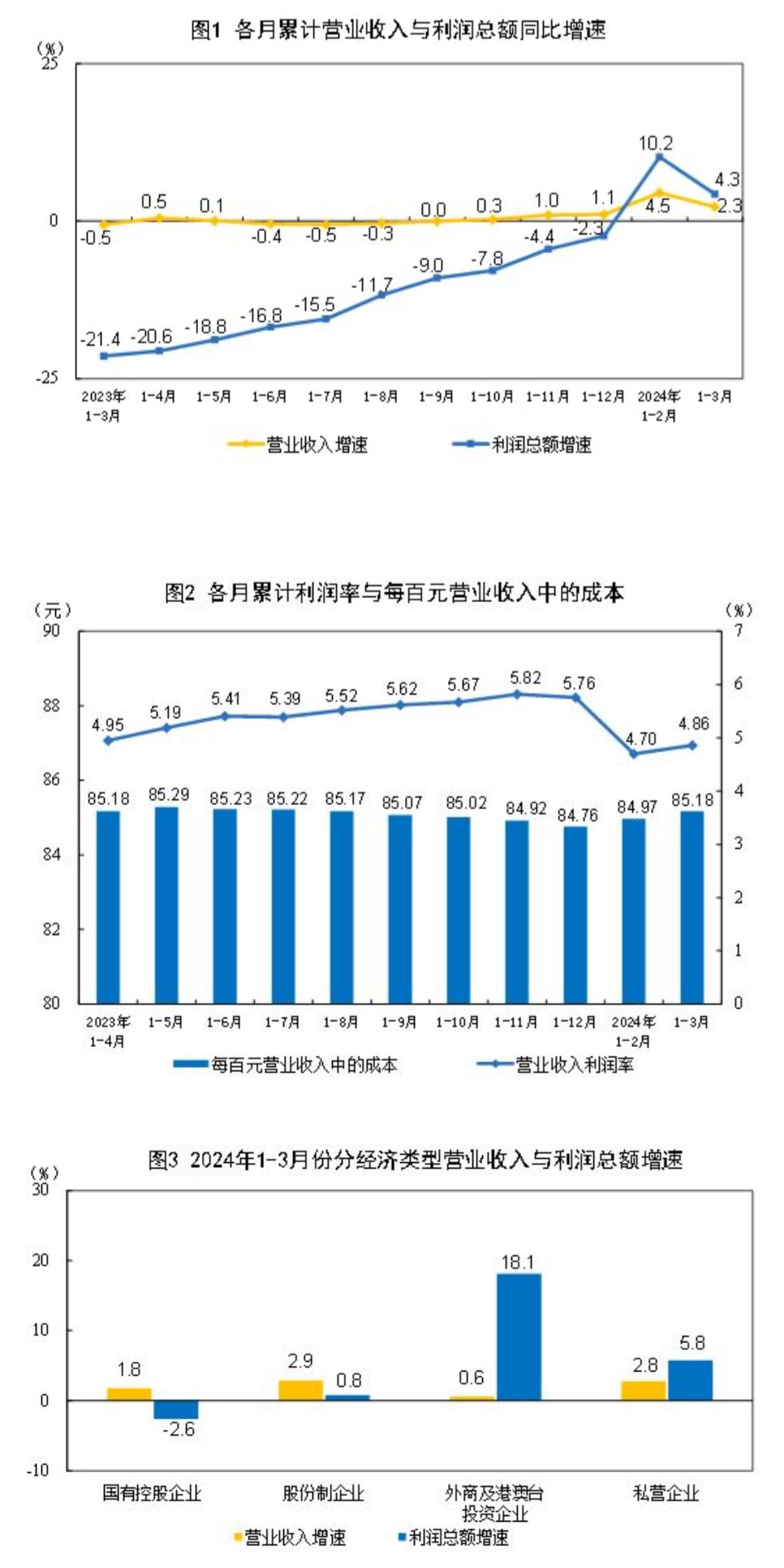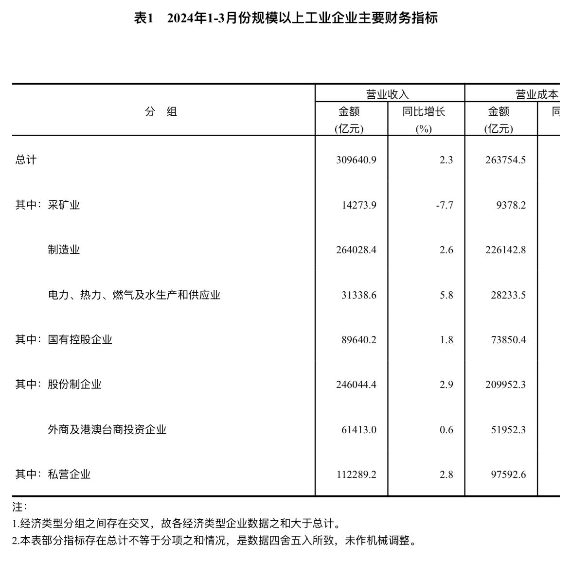 1—3月份,规模以上工业企业实现营业收入30.96万亿元,同比增长2.3%;发生营业成本26.38万亿元,增长2.5%;营业收入利润率为4.86%,同比提高0.09个百分点。