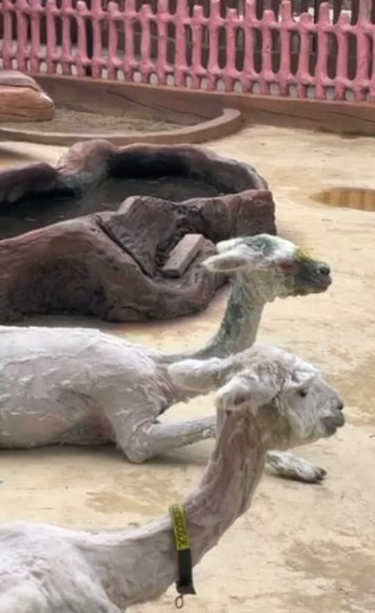 28日下午,乐园工作人员告诉记者,园区共有6只羊驼,视频中的两只已在园区生活1年多。入夏后,园区会给羊驼剃毛,在剃毛时发现两只羊驼患上轻微皮肤病,兽医经检查,给羊驼涂上青黄色的药剂。