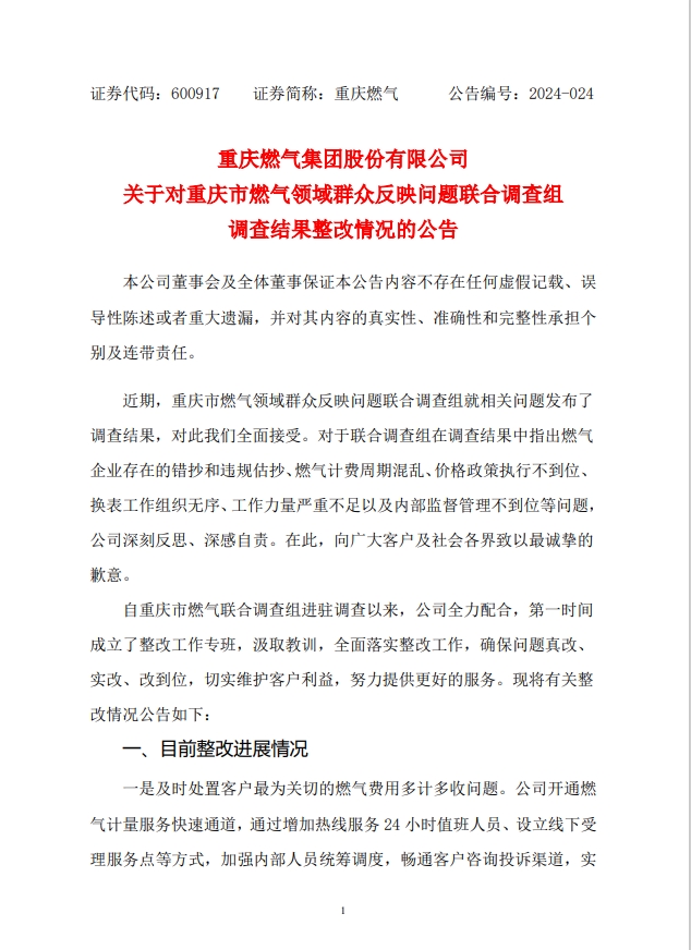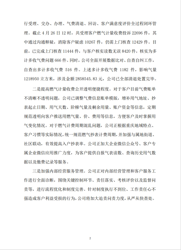 附:重庆燃气关于对重庆市燃气领域群众反映问题联合调查组调查结果整改情况的公告