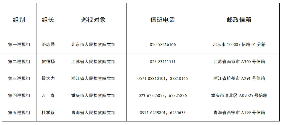 新京报讯(记者行海洋)记者从最高人民检察院获悉,根据最高检党组统一部署,最高检党组第二轮巡视分别对北京、江苏、浙江、重庆、青海等五个省级人民检察院党组开展为期两个月的常规巡视。近日,五个巡视组完成巡视进驻。