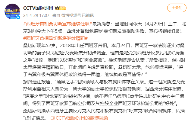 据CCTV国际时讯微博消息,当地时间今天(4月29日)上午,北京时间今天下午5点,西班牙首相佩德罗·桑切斯发表视频讲话,宣布将继续任职。