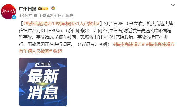 据@广州日报微博消息,5月1日2时10分左右,梅大高速大埔往福建方向K11+900m(茶阳路段出口方向2公里左右)附近发生高速公路路面塌陷事故。事故造成18辆车被困,现场救出31人送往医院救治。事故救援正在进行,事故原因正在进行调查。(文/记者:李妍)