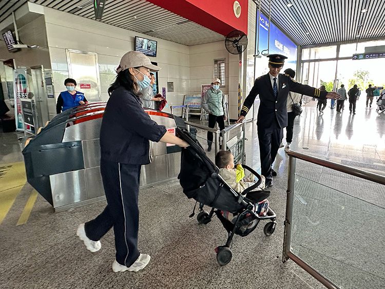 工作人员协助一位推婴儿车的乘客走无障碍通道。据了解,乘坐地铁前往北京车展观展的乘客大多集中在10点至11点间到站(北京车展10点起观众可以入场),下午3点以后将进入散场高峰时段,国展地铁站客流将较为集中,乘客出行可以注意错峰。