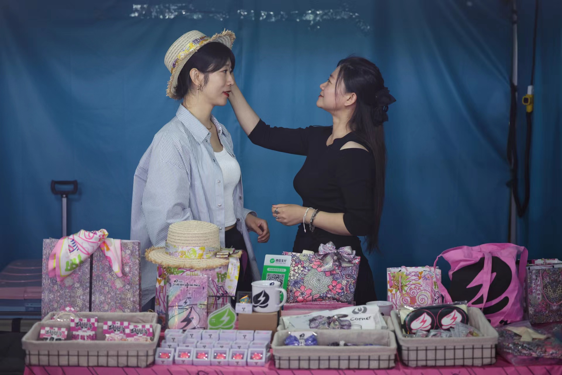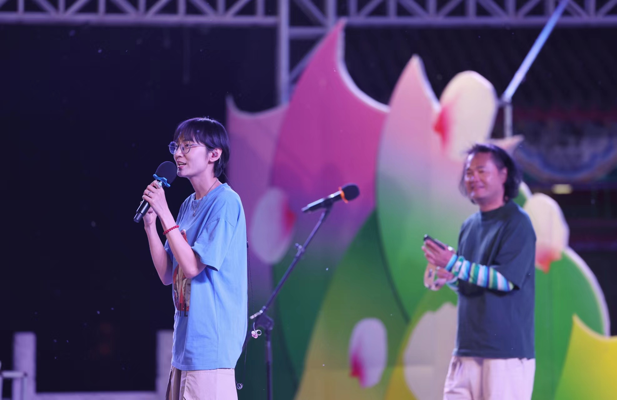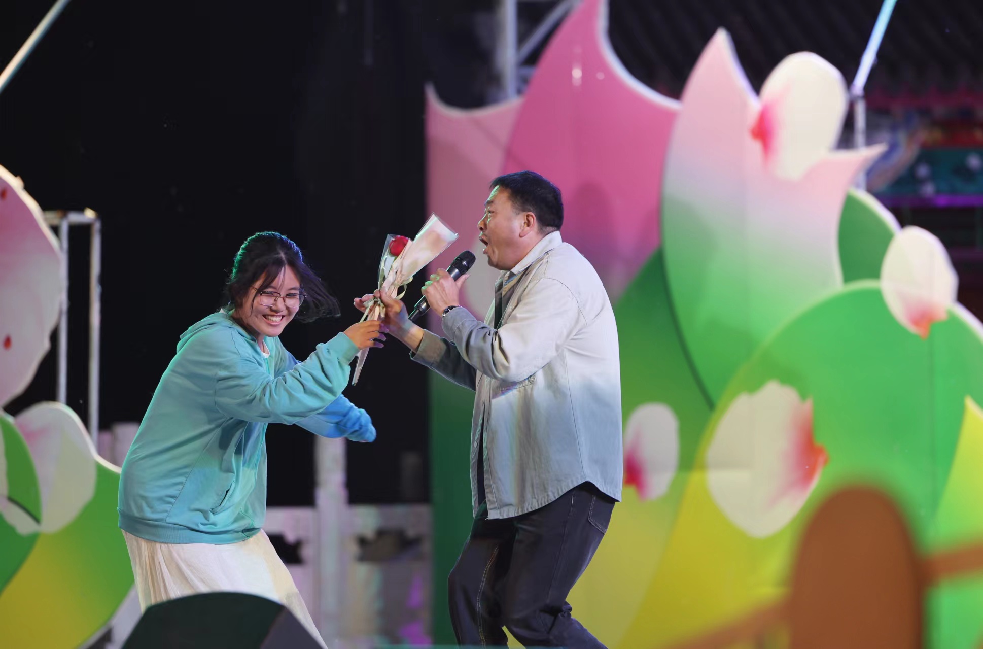 一位观众上台献花。戏歌《高大尚》、老调大鼓《唱咱平谷的山》、戏歌伴舞《农民的生活比蜜甜》、《桃醉平谷》等多个极具特色的乡村音乐节目接连登场,数千名城乡居民和游客欢聚一堂,舞台上下热情互动,展示美好生活,点赞劳动风采。