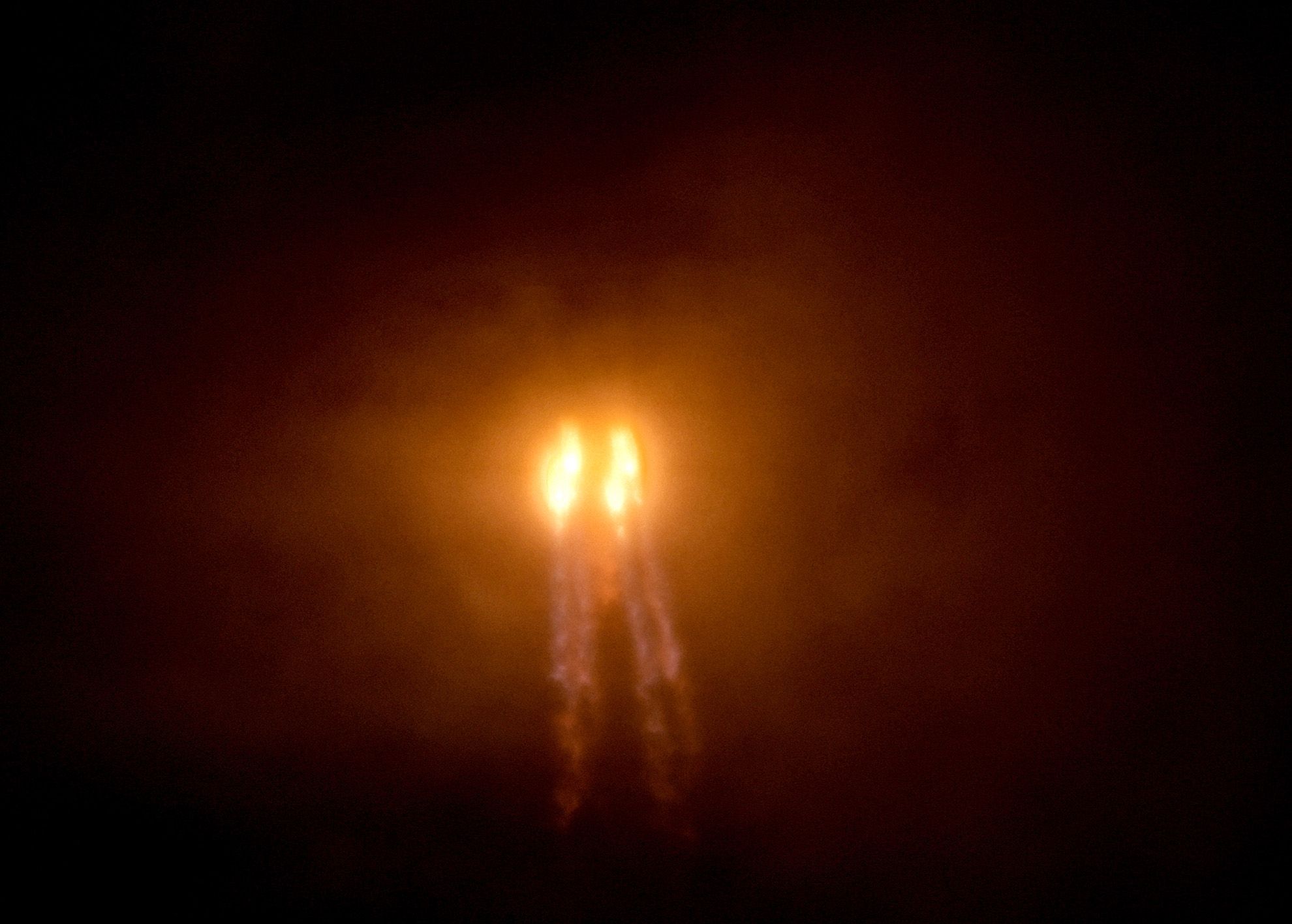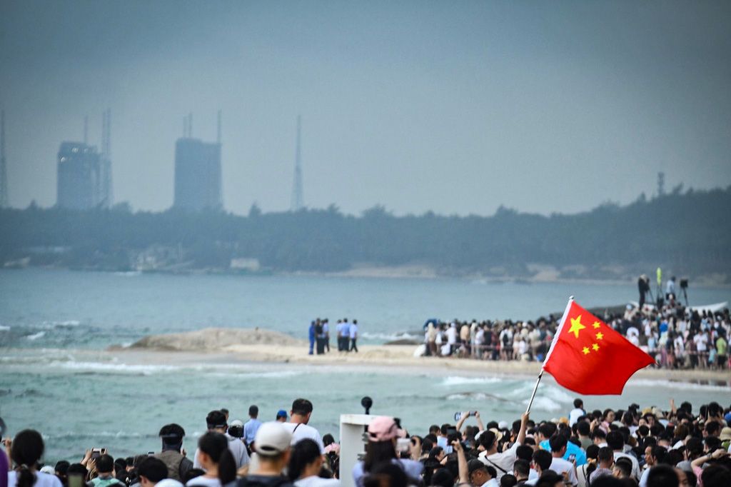 中国文昌航天发射场外,人们在海滩上观看火箭发射。