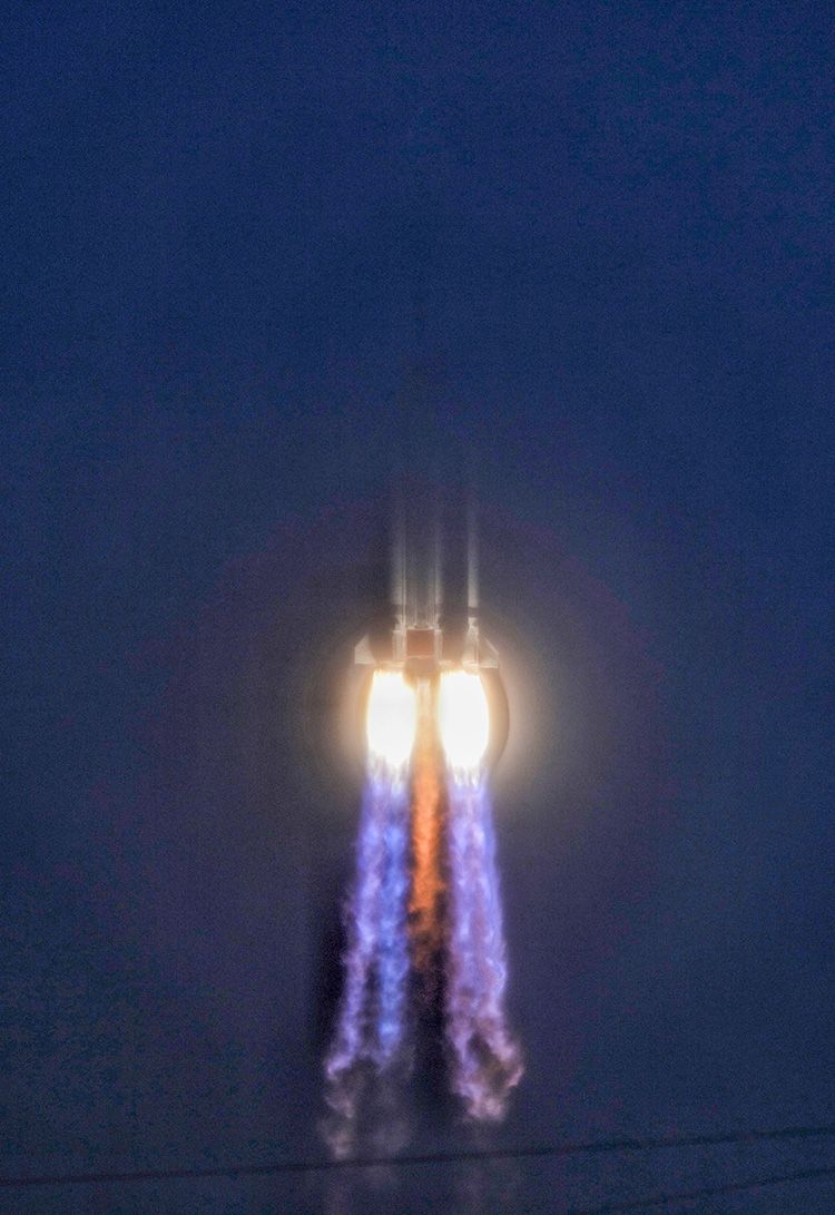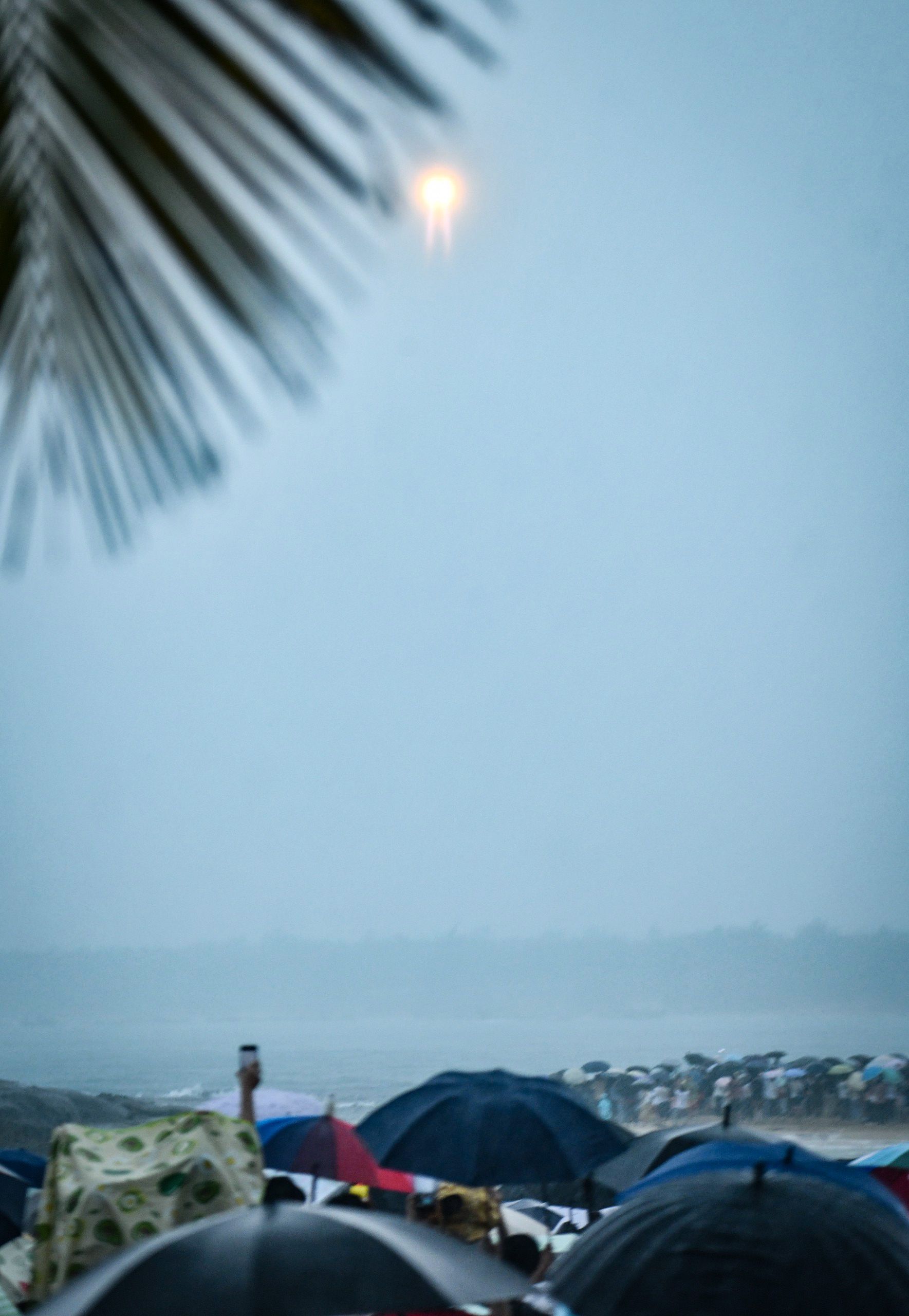 中国文昌航天发射场外,人们打着伞观看火箭发射。