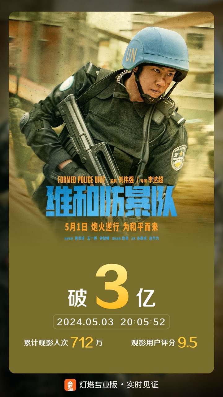 新京报讯(记者周慧晓婉)据灯塔专业版,截至5月3日20时05分,影片《维和防暴队》上映3天,票房突破3亿,累计观影人次已达712万。