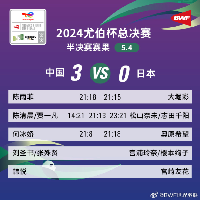 据@新华社 消息,5月4日,在四川省成都市举行的尤伯杯羽毛球团体赛半决赛中,中国队大比分3比0战胜日本队,晋级决赛。