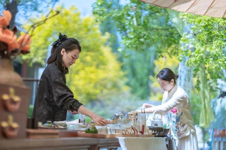 牡丹文化节期间,推出了多项文化活动。古韵市集上,游客品茗赏景。