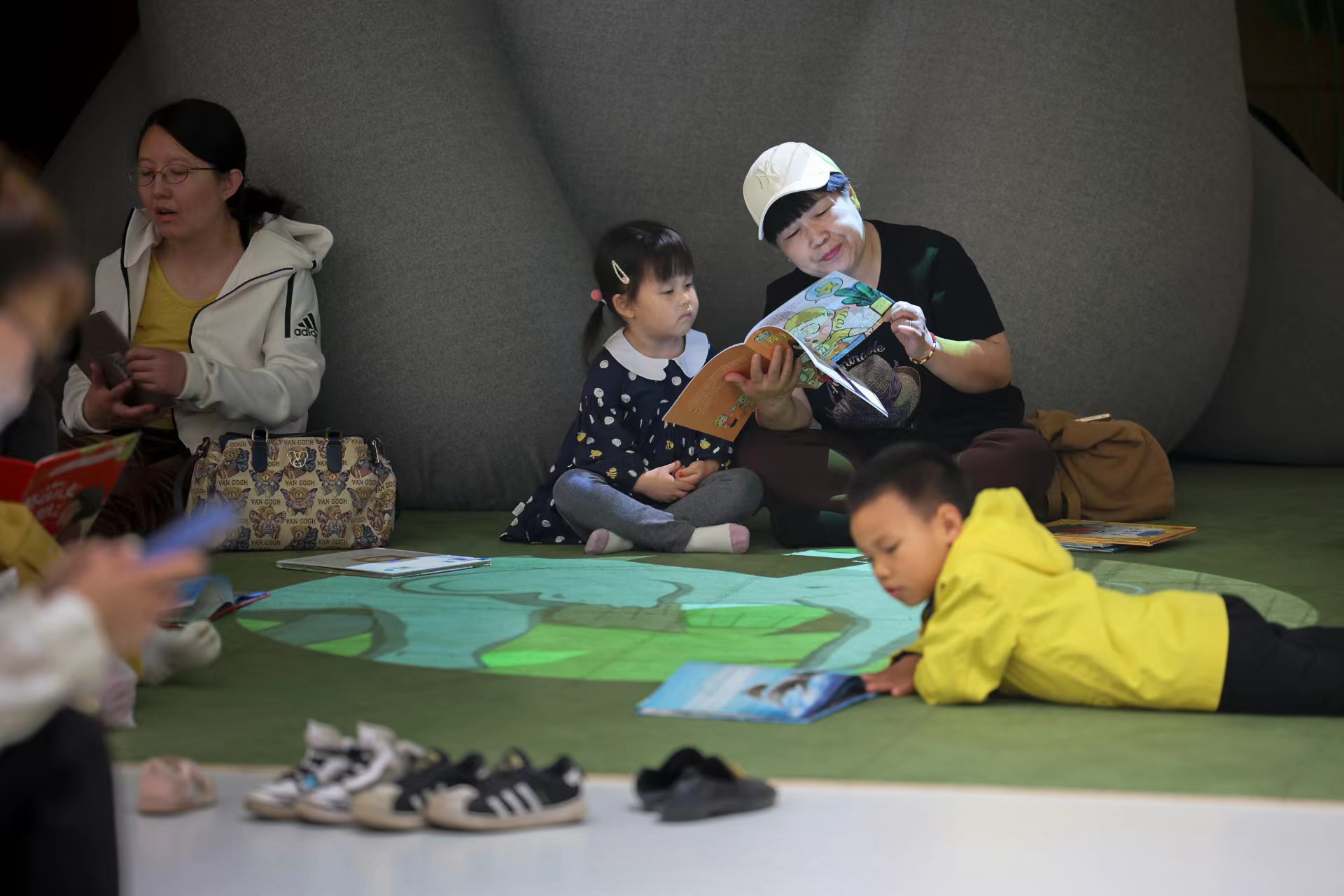 少年儿童馆的亲子阅读区,家长带着小朋友阅读书籍。