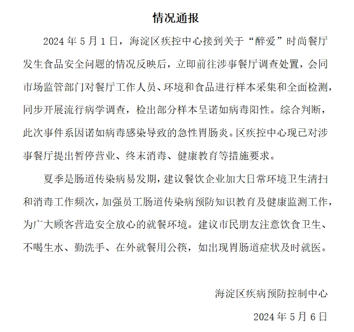 北京海淀疾控通报“醉爱”餐厅食品安全问题:诺如病毒导致