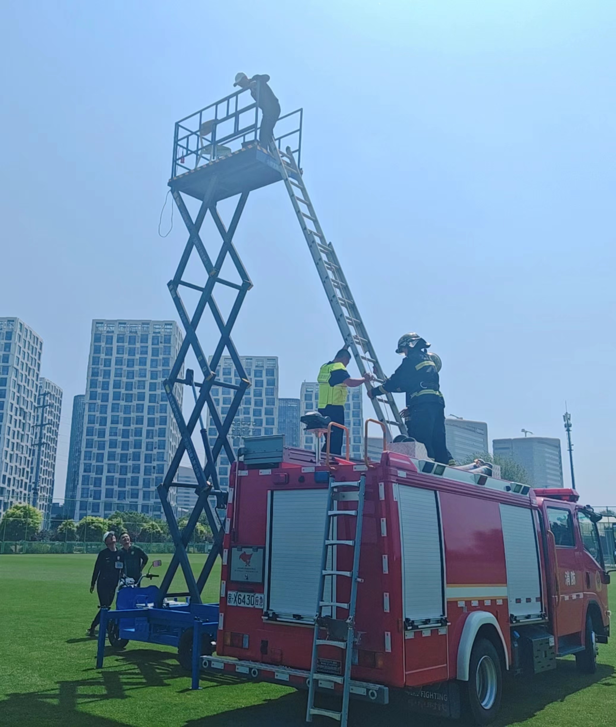 消防员到场后了解到,工作人员张师傅本来是在三轮举升车上拍摄球队训练,拍摄结束后,张师傅的同事发现设备出现故障,举升车无法下降。