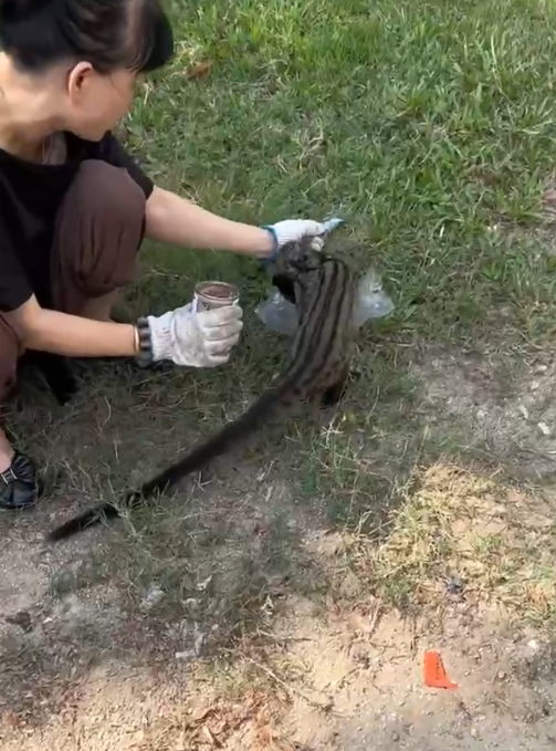 网传视频显示,在一栋名为“水晶宫大酒楼”的建筑前,一只有着黑色条纹皮毛和长尾巴的动物在草地上不时发抖,旁边一名女子正在喂食,引发路人围观。视频拍摄者称,该动物是国家一级保护动物小灵猫,已被相关部门带走安置。