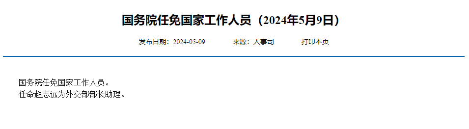 任命赵志远为外交部部长助理。