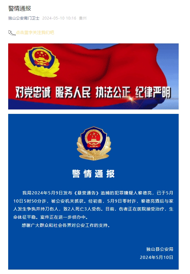 新京报讯 据独山公安南门卫士官微消息, 独山县公安局2024年5月9日发布《悬赏通告》追捕的犯罪嫌疑人黎德亮,已于5月10日5时50分许,被公安机关抓获。经初查,5月9日零时许,黎德亮酒后与家人发生争执并持刀伤人,致2人死亡3人受伤。目前,伤者正在医院接受治疗,生命体征平稳。案件正在进一步侦办中。