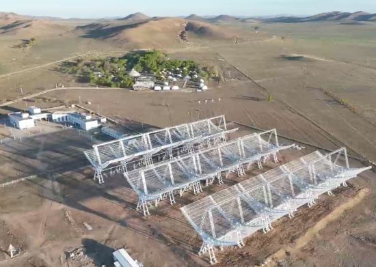 IPS望远镜是我国首台专门用于行星际闪烁观测的射电望远镜,由中国科学院国家空间科学中心牵头,中国电子科技集团公司等参与共同建设。该设备采用一主站两辅站的协同联测方式,分别部署于内蒙古锡林郭勒盟的明安图主站、伊和高勒辅站、乌日根塔拉辅站。三台站之间的两两连线近似组成等边三角形,站间距约200公里。主站拥有目前我国最大的抛物柱面射电望远镜,由三排南北长140米、东西宽40米的抛物柱面天线组成。
