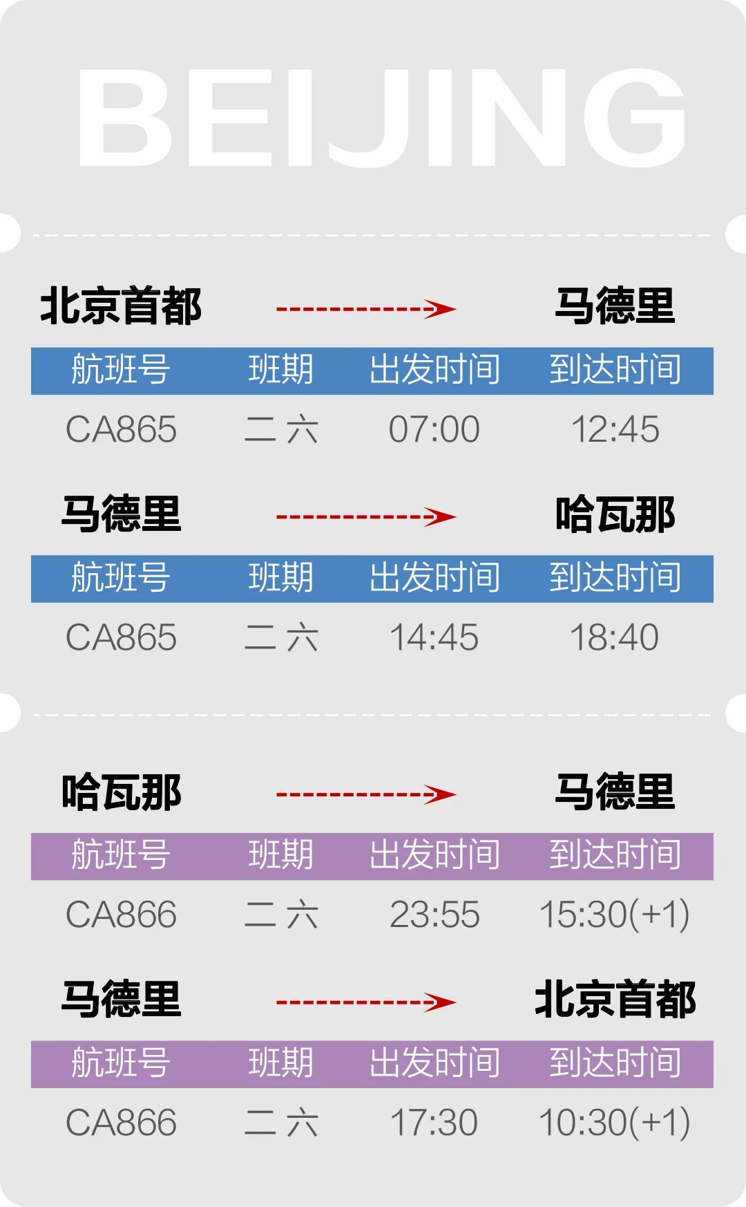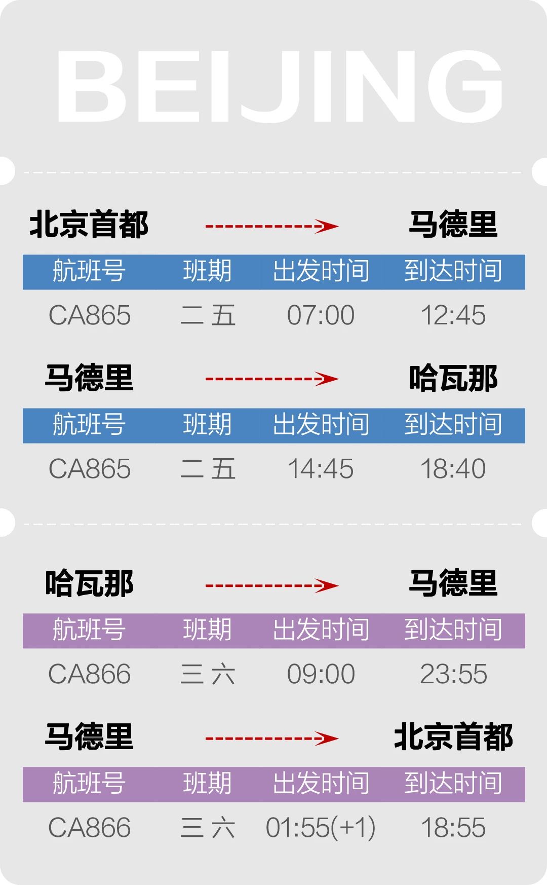 新京报讯 据“中国民航网”消息,近日,古巴政府宣布对持普通护照入境、过境古巴且停留不超过90天的中国公民实施免签政策。据悉,5月17日起,国航将恢复北京—马德里—哈瓦那航班运行,每周两班,航线往返航班号为CA865/6。具体信息如下: