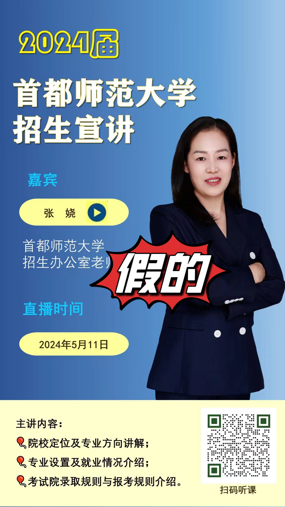 新京报记者从首都师范大学知情人处了解到,其同事接到有关中学的咨询才发现这一冒充行为。在对方提供的名为《2024届首都师范大学招生宣讲》的电子海报显示,宣讲嘉宾是“首都师范大学招生办公室老师张娆”,首都师范大学证实此人并非该校人员。