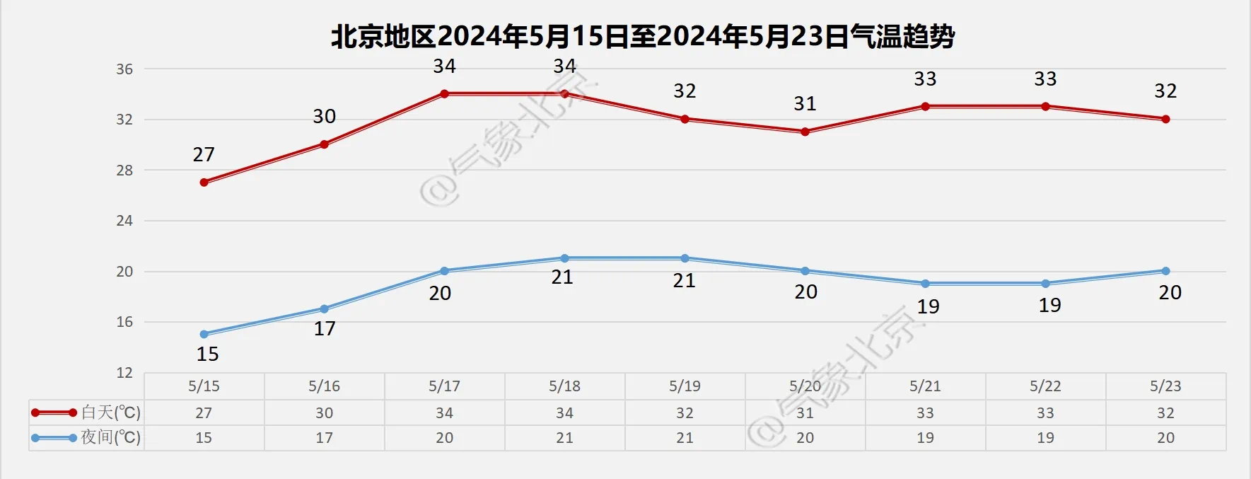 根据最新的气象资料分析,5月15日至23日,北京以晴到多云天气为主,气温上升,白天最高气温在27℃至34℃之间,其中本周五(5月17日)气温可冲至34℃,紫外线强,户外注意防暑防晒;夜间最低气温在15℃至21℃之间,早晨体感略凉,请适时调整着装。